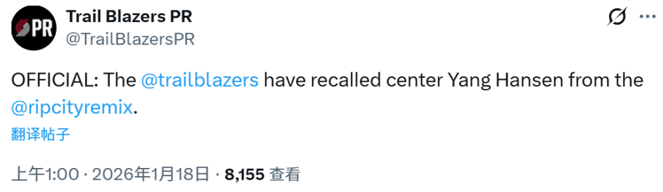 北京时间1月18日,开拓者官方宣布从混音召回了杨瀚森,他有望出战今日主场对湖人的比赛。如果杨瀚森在这场比赛中登场,这将是一次背靠背的比赛。昨日G联赛对阵蓝队,杨瀚森拿到14分17篮板2助攻2盖帽,出现3次失误5次犯规,篮板创G联赛生涯新高。